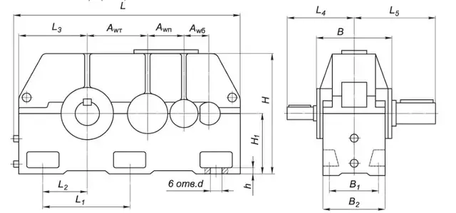 | Типорозмір редуктора | Аw т | Аw п | Аw б | В | B1 | Н | H1 | h | L | L1 | L2 | L3 | L4 | L5 | d |