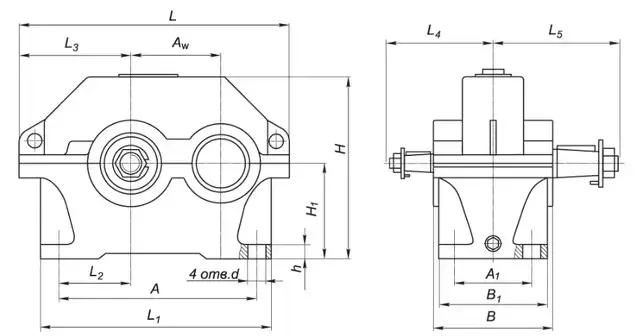 | Типоразмер редуктора | Аw | А | А1 | В | B1 | Н | H1 | h | L | L1 | L2 | L3 | L4 | L5 | d |