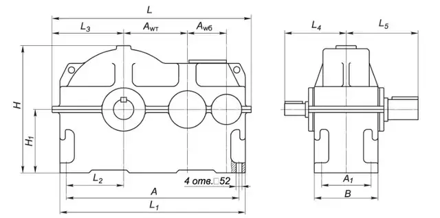 | Типоразмер редуктора | Аw Т | Аw б | А | А1 | В | Н | H1 | L | L1 | L2 | L3 | L4 | L5 | |